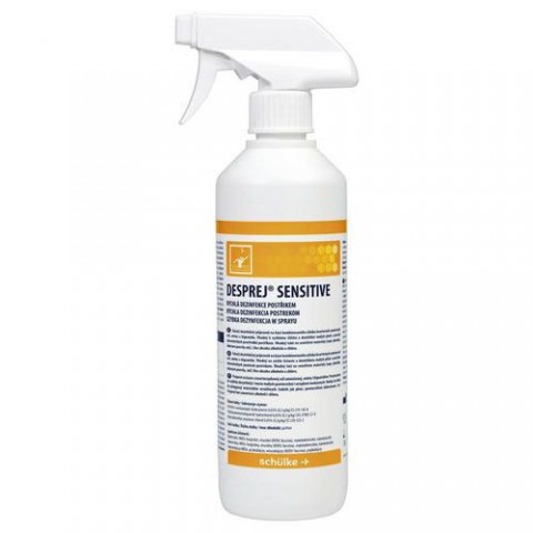 Vhodný k dezinfekci citlivých materiálů (plexiskla, lesklé plasty, lakované povrchy, dotykové monitory, inkubátory, UZV sondy). Neodbarvuje a nepůsobí dráždivě. Jemně parfemován příjemnou vůní. Bez alkoholu - nevysušuje pokožku. Účinek již od 1 minuty. Složení (účinné látkyve 100 g přípravku) - N-(3-aminopropyl)-N-dodecylpropan-1,3-diamin 0,02 g, Poly(hexametylenbiguanid) hydrochlorid 0,05 g, Kvarterní amoniové soli 0,05 g. Desprej® sensitive je vhodný také na moderní zdravotnické prostředky, přístroje a pomůcky z plastů a plexiskel (inkubátory, obrazovky, UZV sondy, klávesnice, monitory atd.) Doba použitelnos 24 měsíců. A - baktericidní ? (B) - virucidní na BVDV/Vaccinia ? T - tuberkulocidní (M. terrae) ? M - mykoaktericidní (M. avium, M. terrae) ? (V) - levurocidní (C. albicans) ? V- fungicidní (C. albicans, A. niger / brasiliensis) ? B - plně virucidní (Polio, Adeno, Noro=MNV) Zdravotnický prostředek tř. IIa.Desprej Sensitive 500ml bezoplachová dezinfekce na plochy a povrchy