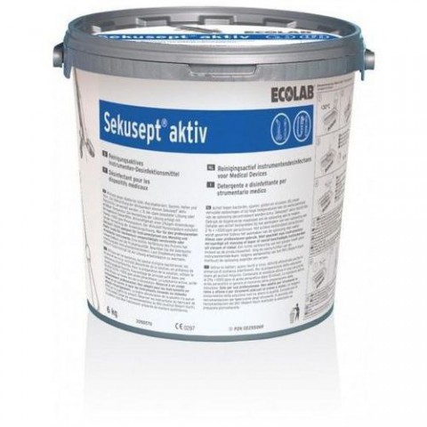 Vysoce účinný čistící a dezinfekční přípravek pro nástrojovou dezinfekci včetně endoskopů a dezinfekci a čištění ploch a povrchů včetně koupacích van. Nová receptura - výrazný a rychlý účinek, neobsahuje aldehydy, pro manuálně prováděnou dezinfekci, ultrazvukové lázně, mycí poloautomaty, vynikající materiálová snášenlivost - pH pracovního roztoku 8, zcela rozpustný, bez zbytkových reziduí, možnost kontroly koncentrace účinné látky (testovací proužky), bezpečný a ekologický. Spektrum účinnosti: baktericidní (vč. TBC), virucidní (vč. HBV, HIV, Vaccinia, Adeno, Papova, Polio), fungicidní, sporicidní Složení: tetraacetylethylendiamin, peroxouhličitan sodný, neionogenní tenzidy, inhibitory koroze, komplexotvorné látky, parfemační přísady. Oblast použití: Pro aktivní čištění a dezinfekci zdravotnického instrumentária včetně endoskopů, anesteziologického příslušenství apod., ve všech typech zdravotnických zařízení, laboratořích, farmaceutické výrobě atdDezinfekční přípravek Sekusept Aktiv 6kg pro nástroje a plochy