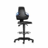 Pracovní židle do laboratoře nebo dílny s ergonomickým sedákem a opěradlem. Nastavitelné opěradlo zajišťuje permanentní kontakt se zády uživatele a tím uleví páteři a zádovým svalům. Výškově nastavitelná podnožka poskytuje oporu nohou. Potah ze syntetické kůže je omyvatelný, odolný olejům a dezinfekčním prostředkům. Stop and go kolečka se při používání židle automaticky zabrzdí a zajistí perfektní stabilitu židle. Výška sedáku nastavitelná plynovým pístem. Měkká kolečka vhodná pro tvrdé podlahy.Dílenská židle Bimos Ergoconfort Vinyl s podnožkou a měkkými kolečky
