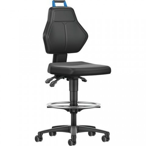 Pracovní židle do dílny a průmyslová pracoviště. Sedací plocha z imitace kůže. Výškově nastavitelné opěradlo pro optimální bederní podporu. Nastavení výšky a sklonu sedadla. Stabilitu zajišťuje plastový kříž s kolečky, kovová nožní opěrka.Dílenská židle Manutan Expert Crux