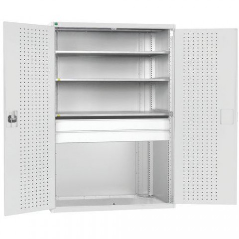 Kovové dílenské skříně vybaveny policemi s nosností 160 kg a zásuvkami pro efektivní využití v provozech a dílnách. Robustní svařovaná ocelová konstrukce s nosností až 1,5 tuny, povrchová úprava práškovým lakem. Vyztužené křídlové dveře s perforovanou vnitřní stranou pro uložení nářadí. Tříbodový cylindrický rozvorový zámek se dvěma klíči. Pozinkované police výškově nastavitelné v rastru 25 mm. Zásuvky s nosností 75 kg a 100% výsuvem na válečkových ložiskách.Dílenské skříně se zásuvkami Bott Cubio 160, výška 200 cm