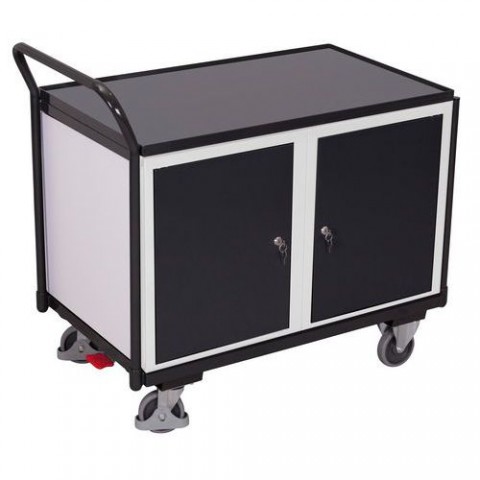 Dílenský vozík je rozdělen na dvě uzamykatelné skříňky, na kterých se nachází odkládací prostor. Manipulace s vozíkem na dvou pevných a dvou otočných kolečkách s brzdou pomocí praktického madla. Jednotlivé skříňky jsou centrálně uzamykatelné a obsahují dvě police, které lze vytáhnout. Volné odkládací prostory na vrchní části skříněk jsou ohraničeny L - profily, ve kterých jsou usazeny MDF desky.Dílenské vozíky se 2 skříňkami, 101 x 112,5 x 62,5 cm