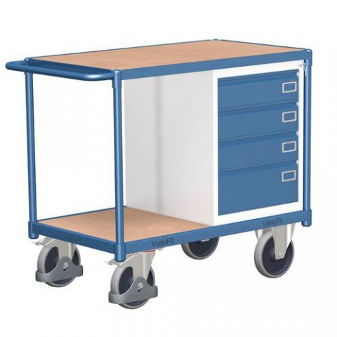 Dílenský vozík je vybaven plechovou zásuvkovou skříňkou se čtyřmi zásuvkami a centrálním uzamykáním. Mobilitu dílenského vozíku zajišťují dvě pevná a dvě otočná pryžová kola s brzdou.Dílenské vozíky se 4 zásuvkami, 93 x 119 x 60 cm
