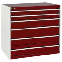 Zásuvkové skříně Bott Cubio se zásuvkami s nosností 75 kg a 100% výsuvy na válečkových ložiskách. Robustní svařovaná ocelová konstrukce s nosností až 1,5 tuny, povrchová úprava práškovým lakem. Systém centrálního zámku i blokace otevření více zásuvek najednou. Ergonomické rukojeti s popisovatelnou lištou, uzamykání cylindrickým zámkem se dvěma klíči.Dílenské zásuvkové skříně Bott Cubio, 100 x 105 x 65-75 cm, 6 zásuvek