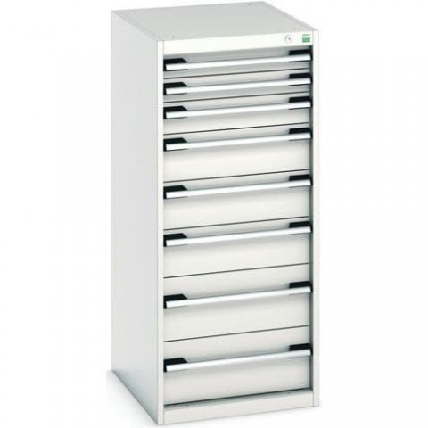 Zásuvkové skříně Bott Cubio se zásuvkami s nosností 75 kg a 100% výsuvy na válečkových ložiskách. Robustní svařovaná ocelová konstrukce s nosností až 1,5 tuny, povrchová úprava práškovým lakem. Systém centrálního zámku i blokace otevření více zásuvek najednou. Ergonomické rukojeti s popisovatelnou lištou, uzamykání cylindrickým zámkem se dvěma klíči.Dílenské zásuvkové skříně Bott Cubio, 120 x 52,5 x 52,5-65 cm, 8 zásuvek