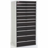 Zásuvkové skříně Bott Cubio se zásuvkami s nosností 75 kg a 100% výsuvy na válečkových ložiskách. Robustní svařovaná ocelová konstrukce s nosností až 1,5 tuny, povrchová úprava práškovým lakem. Systém centrálního zámku i blokace otevření více zásuvek najednou. Ergonomické rukojeti s popisovatelnou lištou, uzamykání cylindrickým zámkem se dvěma klíči.Dílenské zásuvkové skříně Bott Cubio, 160 x 80 x 52,5-75 cm, 11 zásuvek