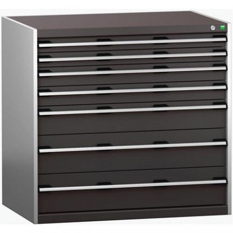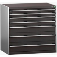 Zásuvkové skříně Bott Cubio se zásuvkami s nosností 200 kg a 100% výsuvy na válečkových ložiskách. Robustní svařovaná ocelová konstrukce s nosností až 1,5 tuny, povrchová úprava práškovým lakem. Systém centrálního zámku i blokace otevření více zásuvek najednou. Ergonomické rukojeti s popisovatelnou lištou, uzamykání cylindrickým zámkem se dvěma klíči.Dílenské zásuvkové skříně Bott Cubio 200, 100 x 105 x 65-75 cm, 7 zásuvek