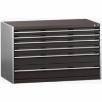 Zásuvkové skříně Bott Cubio se zásuvkami s nosností 200 kg a 100% výsuvy na válečkových ložiskách. Robustní svařovaná ocelová konstrukce s nosností až 1,5 tuny, povrchová úprava práškovým lakem. Systém centrálního zámku i blokace otevření více zásuvek najednou. Ergonomické rukojeti s popisovatelnou lištou, uzamykání cylindrickým zámkem se dvěma klíči.Dílenské zásuvkové skříně Bott Cubio 200, 80 x 130 x 65-75 cm, 6 zásuvek