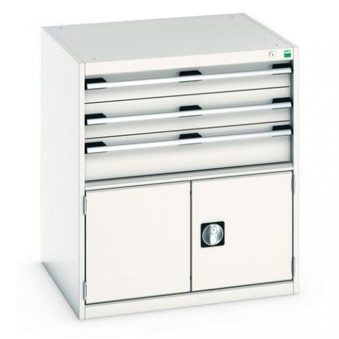 Zásuvkové skříně Bott Cubio se zásuvkami s nosností 200 kg a 100% výsuvy na válečkových ložiskách. Robustní svařovaná ocelová konstrukce s nosností až 1,5 tuny, povrchová úprava práškovým lakem. Systém centrálního zámku i blokace otevření více zásuvek najednou. Ergonomické rukojeti s popisovatelnou lištou, uzamykání cylindrickým zámkem se dvěma klíči.Dílenské zásuvkové skříně Bott Cubio 200, 90 x 80 x 65-75 cm, 3 zásuvky, 1 skříňka