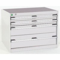 Zásuvkové skříně Bott Cubio se zásuvkami s nosností 75 kg a 100% výsuvy na válečkových ložiskách. Robustní svařovaná ocelová konstrukce s nosností až 1,5 tuny, povrchová úprava práškovým lakem. Systém centrálního zámku i blokace otevření více zásuvek najednou. Ergonomické rukojeti s popisovatelnou lištou, uzamykání cylindrickým zámkem se dvěma klíči.Dílenské zásuvkové skříně Bott Cubio, 60 x 80 x 52,5-75 cm, 4 zásuvky