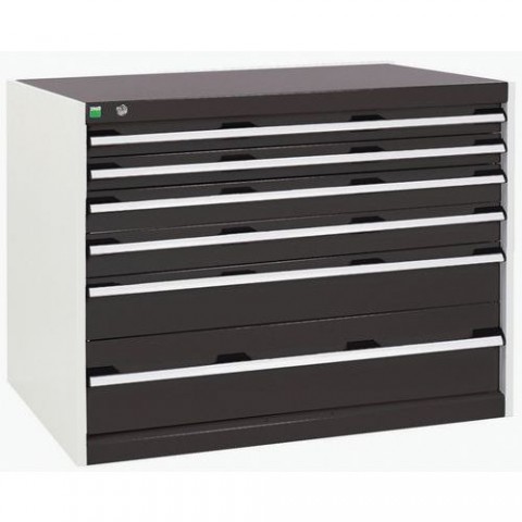 Zásuvkové skříně Bott Cubio se zásuvkami s nosností 75 kg a 100% výsuvy na válečkových ložiskách. Robustní svařovaná ocelová konstrukce s nosností až 1,5 tuny, povrchová úprava práškovým lakem. Systém centrálního zámku i blokace otevření více zásuvek najednou. Ergonomické rukojeti s popisovatelnou lištou, uzamykání cylindrickým zámkem se dvěma klíči.Dílenské zásuvkové skříně Bott Cubio, 80 x 105 x 65-75 cm, 6 zásuvek