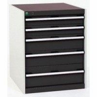 Zásuvkové skříně Bott Cubio se zásuvkami s nosností 75 kg a 100% výsuvy na válečkových ložiskách. Robustní svařovaná ocelová konstrukce s nosností až 1,5 tuny, povrchová úprava práškovým lakem. Systém centrálního zámku i blokace otevření více zásuvek najednou. Ergonomické rukojeti s popisovatelnou lištou, uzamykání cylindrickým zámkem se dvěma klíči.Dílenské zásuvkové skříně Bott Cubio, 80 x 65 x 52,5-75 cm, 5 zásuvek