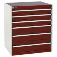 Zásuvkové skříně Bott Cubio se zásuvkami s nosností 75 kg a 100% výsuvy na válečkových ložiskách. Robustní svařovaná ocelová konstrukce s nosností až 1,5 tuny, povrchová úprava práškovým lakem. Systém centrálního zámku i blokace otevření více zásuvek najednou. Ergonomické rukojeti s popisovatelnou lištou, uzamykání cylindrickým zámkem se dvěma klíči.Dílenské zásuvkové skříně Bott Cubio, 90 x 80 x 52,5-75 cm, 6 zásuvek