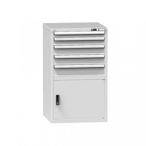 Dílenská skříňka s pěti zásuvkami a jednou vnitřní policí. Zásuvková skříň je opatřená mechanismem centrálního zamykání a blokace zásuvek. Standardně jsou zásuvkové skříně osazeny cylindrickými zámky, ke každému zámku jsou dodávány dva klíče. K dostání ve 3 barvách.Dílenské zásuvkové skříně ZB,1215 x 731 x 753 mm, 5 zásuvek, 1 skříňka, šedá