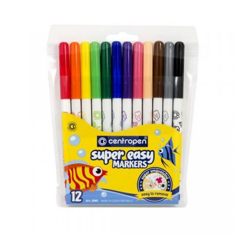 Sada popisovačů s ventilačním bezpečnostním chránítkem, ergonomický úchop pro lepší držení. Zdravotně nezávadný, vypratelný inkoust na vodní bázi, který lze odstranit z kůže proudem vody. Válcové hroty jsou odolné proti zatlačení. Barvy jsou syté a zářivé. Praktické balení s eurozávěsem. Mix barev. Válcový hrot.Fix CENTROPEN sada 2580/12 barev SUPER EASY