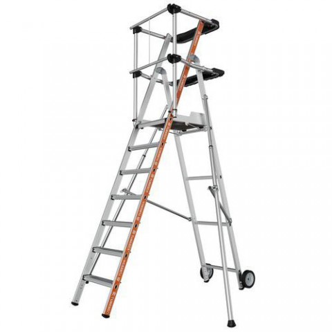 Duální policové platformy Raptor. Pevné 4stranné zábradlí s ochrannými lištami proti pádu s poloautomatickým zavíráním. 80 mm protiskluzové schůdky. Odnímatelný přihrádkový držák nářadí s nosností 25 kg, integrované háčky s nosností max. 10 kg. Protiskluzová podlaha o rozměrech 500 x 400 mm z ekologického dřeva. Ergonomický pracovní prostor. Výsuvné stabilizátory s milimetrovým nastavením.Hliníkové plošiny Raptor Tubesca-Comabi, dvě police