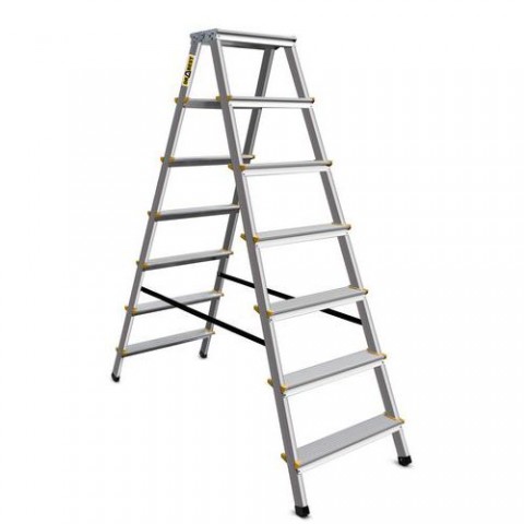 Skládací oboustranné schůdky vhodné do domácností, skladů nebo archívů. Protiskluzový rýhovaný povrch stupňů, vzdálenost mezi stupni je 23 cm. Opatřené ochrannými protiskluzovými patkami. Splňují normu ČSN EN 131 a mají TÜV certifikát. Nosnost 150 kg.Hliníkové schůdky Verona BY s plošinou, oboustranné, 2 x 7 stupňů
