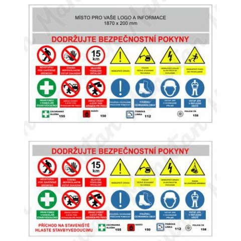 Bezpečnostní značky, tabulky nebo samolepky "Banner - Areál stavby" splňují požadavky právních a technických předpisů, zejména Nařízení vlády č. 375/2017 Sb., ČSN ISO 3864-1, ČSN ISO 3864-2, ČSN ISO 3864-3, ČSN ISO 3864-4. Bezpečnostní tabule (banner) - areál stavby - je určen pro předepsané bezpečnostní označení celého areálu stavby i s provozem vozidel a stavební techniky. Na banneru jsou vyobrazeny základní bezpečnostní tabulky, možná pracovní rizika, důležitá telefonní čísla a prostor pro vepsání údajů (zde staví, odpovědná osoba, apod.). Banner je vysoce kvalitní, coatovaná, měkká PVC plachtovina (banner) s jasným bílým povrchem, který v kombinaci s BRILITE vrstvou, zvyšuje barevnou hloubku a kvalitu tisku. Nehořlavost, vysoká odolnost proti UV záření a odolnost proti tvorbě plísní. Pevnost v tahu při upevnění ocelovými oky je tak vysoká, že 1 m2 upevněný volně v prostoru 4 oky vydrží sílu větru i 118 km/hod (orkán). Je vhodný pro interiérové a dlouhodobé exteriérové aplikace. Informační tabulky - Areál stavby bezpečnostní banner