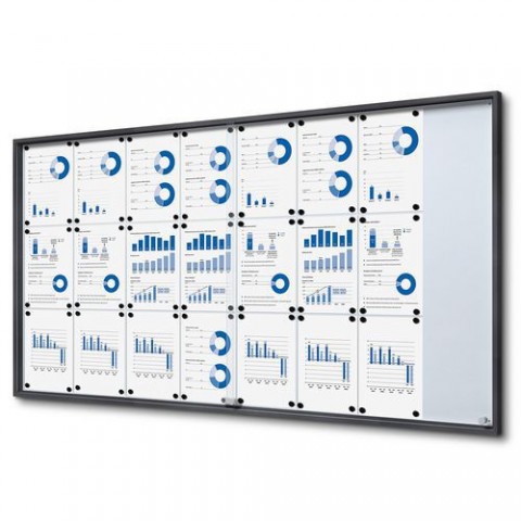 Elegantní vitrína se štíhlými posuvnými dveřmi zajistí čistou a přehlednou prezentaci. Skleněné bezpečnostní dveře a ocelová zadní deska vytvářejí profesionální dojem. Povrch vhodný pro popis i magnety umožňuje flexibilní využití. Ideální pro školy, jednací místnosti a veřejné interiéry.Interiérová vitrína SLIM, posuvné skleněné dveře, plech. záda antracit