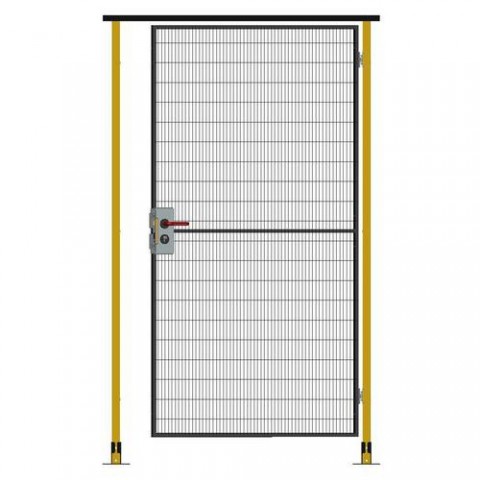 Kompletní jednokřídlé závěsné dveře s cylindrickým zámkem pro systém ochranného oplocení. Cylindrický zámek na klíč umožňuje vstup pouze oprávněným osobám. Klasické dveře s panty jsou vhodným řešením tam, kde je dostatek prostoru. Bezpečnostní oplocení slouží k zajištění bezpečnosti zaměstnanců a návštěvníků tím, že omezuje přístup do nebezpečných nebo citlivých prostor. Chrání před neoprávněným přístupem osob ke strojům a zařízením, vandalismem a krádežemi. Systém oplocení je navržen a vyroben v souladu s normou EN ISO 14120 a splňuje bezpečnostní požadavky hodnocení rizik.Jednokřídlé závěsné dveře, cylindrický zámek