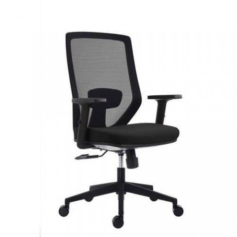 Kacelářská židle s propracovaným ergonomickým tvarem sedáku a opěráku poskytuje uživateli pohodlí a stálou oporu beder. Vysoce kvalitní síťovaný opěrák s vertikálně nastavitelnou bederní opěrkou. Sedák je vyroben z řezaného molitanu (tloušťka: 50 mm). Synchronní mechanismus s trojnásobnou aretací a možností plynulé proměny úhlu sedáku a opěráku. Nastavení tuhosti mechanismu podle tělesné hmotnosti uživatele. Součástí židle jsou kolečka s gumovou obručí pro všechny typy povrchů s průměrem 60 mm. Výškově nastavitelné plastové područky.Kacelářská židle New Zen, černá