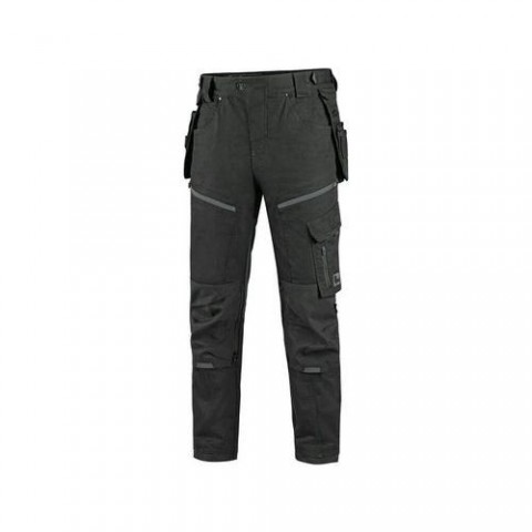 Pánské pracovní kalhoty moderního střihu slim-fit. Kombinace kvalitního směsového materiálu s elastanem a 4-way stretch materiálu v exponovaných místech umožňuje volný a pohodlný pohyb. Vybavení kalhot: flexibilní pas s možností upravení velikosti a poutky na opasek, na vnitřní straně pasu protiskluzový potisk, 2 přední kapsy, 2 odnímatelné kapsy na nářadí vyztuženy materiálem CORDURA®, stehenní zipové kapsy s možností ventilace, boční kapsa se zipovou kapsou, 2 zadní kapsy (jedna zipová) vyztuženy materiálem CORDURA®, kapsa na skládací metr s dalšími přihrádkami, ergonomicky tvarovaná kolena zesílena materiálem CORDURA® s možností vložení kolenních výztuh bočním vkládáním a ventilací, kapsa na ID kartu, spodní část nohavic vyztužena materiálem CORDURA®, reflexní doplňky. Kalhoty jsou vybaveny EASY-PROLONG systémem, který umožňuje snadné prodloužení střihu na vyšší postavu uvolněním švu na nohavicích. Doporučené použití: strojírenství, stavebnictví, lehký průmysl, automobilový průmysl,Kalhoty CXS LEONIS, pánské, černé s šedými doplňky