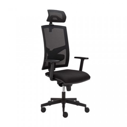 Moderní kancelářská židle se synchronním mechanismem. Vysoká nosnost 150 000 a pogumovaná kolečka. Prodyšné opěradlo ze síťoviny, plný textilní sedák a černý píst. Robustní plastový nylonový kříž a výškově stavitelné područky v rozmězí až 20 cm.Kancelářská židle Asistent II s podhlavníkem, černá