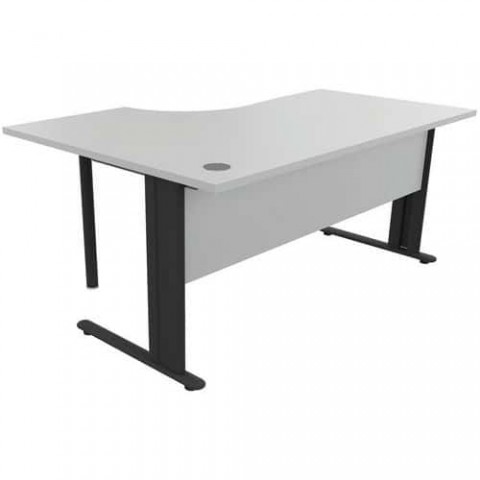 Psací stoly Manutan Expert s deskou z melaminového panelu o tloušťce 25 mm a s kovovým podnožím. Pravé či levé provedení stolu. Antireflexní úprava proti poškrábání. Deska stolu má otvor o průměru 80 mm pro vedení kabelů.Kancelářské stoly Manutan Expert, 72 x 160 - 180 x 110 cm, pravé/levé provedení, světle šedá