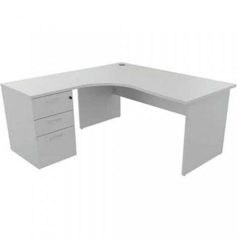Kancelářské psací stoly s kontejnerem jsou dostupné v pravém i levém provedení. Možnost výběru ze dvou různých šířek. Velmi kompaktní - ideální pro malé prostory. Panelové nohy s aretačními šrouby umožňují větší stabilitu stolu. Desky z melaminových panelů o tloušťce 25 mm. Antireflexní úprava proti poškrábání s antibakteriálními vlastnostmi. Otvor v pracovní desce o průměru 80 mm pro vedení kabelů. Kontejner se 3 zásuvkami - 1 na zavěšení pořadačů. Centrální zamykání se 2 klíči.Kancelářské stoly s kontejnerem Manutan Expert, 72 x 160 - 180 x 152 cm, pravé/levé provedení, šedá