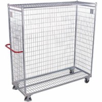 Pozinkovaný klecový vozík s otevřenou boční stěnou. Rozměr oka 100 x 50 mm. Kapsa na dokumenty o rozměru A4. Madlo na čelní straně. Dvě pevná a dvě otočná kola s brzdou. Šedá kola z termoplastické pryže nezanechávající stopy na plastovém ráfku s přesnými kuličkovými ložisky.Klecový vozík s madlem, pozinkovaný, 186 x 65 x 185 cm