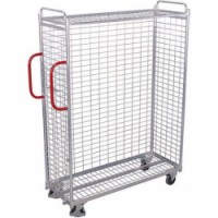 Pozinkovaný klecový vozík s otevřenou boční stěnou. Rozměr oka 100 x 50 mm. Kapsa na dokumenty o rozměru A4. Dvě svislá madla. Dvě pevná a dvě otočná kola s brzdou. Šedá kola z termoplastické pryže nezanechávající stopy na plastovém ráfku s přesnými kuličkovými ložisky.Klecový vozík se svislými madly, pozinkovaný, 143,5 x 49 x 182 cm