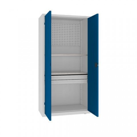 Kovové skříně s perfopanelem pro uložení dílenského nářadí. Vybavené perforovaným panelem, na který lze umístit držáky nářadí a materiálu (nejsou součástí balení). 2 zásuvky a 2 nastavitelné pozinkované police v rastru 25 mm. Monolitická svařovaná konstrukce z oceli tl. 1 mm zajišťuje vysokou pevnost. Vhodné pro profesionální použití ve vnitřních suchých a větraných prostorách. Křídlové dveře s tříbodovým zámkem RONIS (dodáváno se 2 klíči). Vyrovnávací nožky, které jsou nastavitelné zevnitř. Posuvníky pro snadný pohyb skříně a ochranu podlahy. Pro vysokou bezpečnost lze přikotvit ke zdi. Před lakováním jsou skříně potaženy zirkoniovou vrstvou, která je chrání před korozí a zvyšuje přilnavost laku. Skříně jsou opatřené nátěrem, který má klasifikaci reakce na oheň: A2-s1, d0 dle norem PN-EN 13501-1:2019-02. Vyráběno v souladu s normami ISO:9001 a ISO:14001.Kovové dílenské skříně s perfopanelem, 199 x 100 x 50 cm, 2 zásuvky