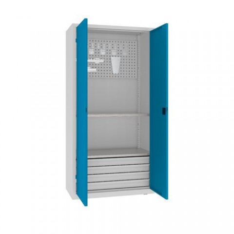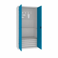 Kovové skříně s perfopanelem pro uložení dílenského nářadí. Vybavené perforovaným panelem, na který lze umístit držáky nářadí a materiálu. 4 zásuvky a 2 nastavitelné pozinkované police v rastru 25 mm. Monolitická svařovaná konstrukce z oceli tl. 1 mm zajišťuje vysokou pevnost. Vhodné pro profesionální použití ve vnitřních suchých a větraných prostorách. Křídlové dveře s tříbodovým zámkem RONIS (dodáváno se 2 klíči). Vyrovnávací nožky, které jsou nastavitelné zevnitř. Posuvníky pro snadný pohyb skříně a ochranu podlahy. Pro vysokou bezpečnost lze přikotvit ke zdi. Před lakováním jsou skříně potaženy zirkoniovou vrstvou, která je chrání před korozí a zvyšuje přilnavost laku. Skříně jsou opatřené nátěrem, který má klasifikaci reakce na oheň: A2-s1, d0 dle norem PN-EN 13501-1:2019-02. Vyráběno v souladu s normami ISO:9001 a ISO:14001.Kovové dílenské skříně s perfopanelem, 199 x 100 x 50 cm, 4 zásuvky