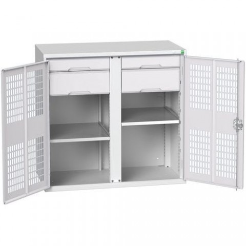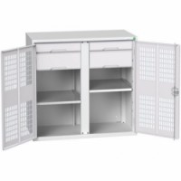 Kovové skříně pro specifické použití v provozech - podle typu vybaveny policemi, zásuvkami, středová přepážka nebo i tyčí na ramínka. Pozinkované police výškově nastavitelné v rastru 25 mm. Zásuvky uloženy na válečkových ložiskách se 100% výsuvem. Svařovaná ocelová konstrukce, povrchová úprava práškovým lakem. Drátěné křídlové dveře s tříbodovým cylindrickým rozvorovým zámkem se dvěma klíči.Kovové skříně pro údržbu s drátěnými dveřmi Bott Verso, výška 100 cm