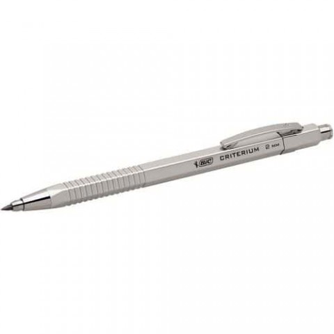 Mechanická tužka se stříbrným tělem a kovovým klipem. Plnitelné tuhou 2mm HB. Praktická mikrotužka s integrovaným ořezávátkem a gumou.Mikrotužka BIC Criterium Silver, 12 ks