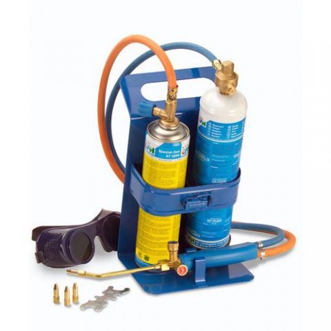 Profesionální přenosná souprava pro svařování, měkké a tvrdé pájení ve všech polohách. Pracovní doba při plném výkonu se střední tryskou je cca 20 minut na kyslíkovou náplň a cca 3 hodiny na náplň s aktivním plynem. Aktivním plynem je vysoce výhřevný směsný plyn AT 3000 skládající se z butanu 65 obj. %, propylenu 25 obj. % a propanu 10 obj. %. Hořák má ostře ohraničený plamen s možností plynulé regulace a pojistku proti zpětnému zášlehu plamene. Pracovní rozsah tloušťky materiálu je 0,1 až 2,5 mm. pracovní teplota: 1 250 °CMini svářecí souprava, 1250 °C, plyn AT 3000 330 g/600 ml, kyslík 130 g/930 ml