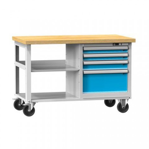 Mobilní dílenský stůl vybavený pevnou pracovní deskou z bukové spárovky. Ve spodní části stolu se nachází jedna výškově nastavitelná police a čtyři centrálně uzamykatelné zásuvky. Stůl je osazen dvěma pevnými a dvěma otočnými kolečky s brzdou z polypropylénu. Nosnost stolu je 380 kg. rozměry v x š x h: 80,5 x 120 x 70cm materiál: ocelový plech, tl. 0,8 mm rozměry pracovní desky v x š x h: 4 x 120 x 70 cm nosnost: 380 kg materiál pracovní desky: buková spárovka výška zásuvky: 2 x 7,5; 1 x 10; 1 x 25 cm nosnost zásuvek: 40 kg počet zásuvek: 3 ks výsuv zásuvek: 88 % počet polic: 1 ks nosnost polic: 50 kg průměr koleček: 125 mm brzděná kolečka: ano barva konstrukce: šedá RAL 7035 barva pracovní desky: buk barva zásuvek: modrá RAL 5012 barva skříňky: modrá RAL 5012 hmotnost: 100 kg uzamykatelnost - 2 klíče, povrchová úprava práškovým lakem, zkompletovánoMobilní dílenský stůl, 81 x 120 x 70 cm