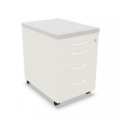 Kancelářský kontejner pro ukládání kancelářských pomůcek a dokumentů. Vhodné umístění pod pracovní stůl. Vybavený třemi standardními zásuvkami a jednou menší zásuvkou na ukládání tužek. Zásuvky vyrobené z plastu s 80% výsuvem, opatřené bílou kovovou rukojetí. Pojízdnost zajišťuji čtyři kolečka o průměru 40 mm, z nichž dvě jsou opatřená brzdou.Mobilní kontejner NowyStyl ES Padestal, 4 zásuvky, 60 x 43 x 80 cm
