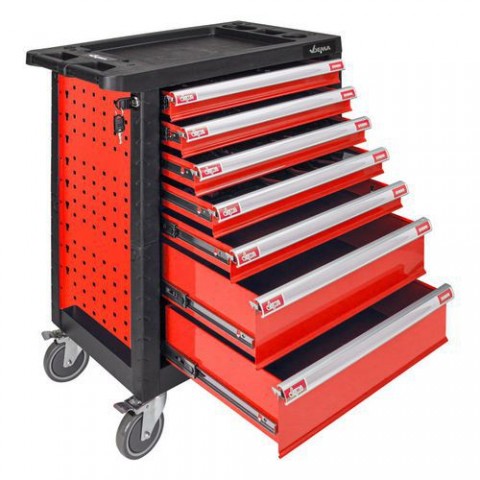 Dílenský servisní vozík vybavený sadou 262 ks nářadí z kvalitní chrom vanadiové oceli. Perforované boční plochy pro dodatečné uchycení nářadí. Ergonomická rukojeť, PVC odkládací plocha a ochrana hran. Pojistka proti otevření zásuvek při pohybu vozíku. Brzděná řídící kola, centrální zamykání, 100% výsuv zásuvek. Povrchová úprava práškovým lakem v červené barvě.Montážní vozík s nářadím, 262 ks, 98 x 78 x 46 cm