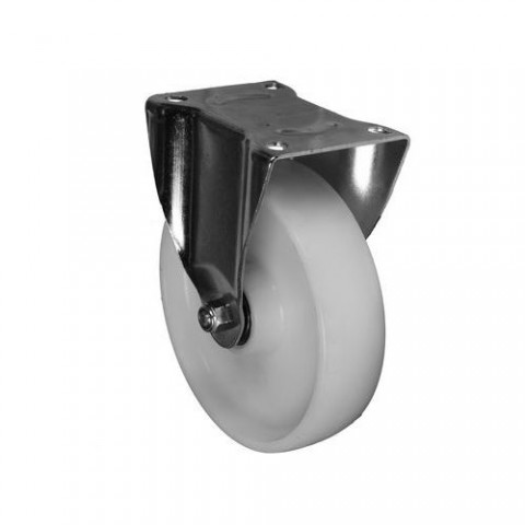 Průmyslová kola s obručí z bílého nylonu. typ kol: pevná materiál kol: nylon průměr kola: 150 - 200 mm šířka kola: 45 mm nosnost: 400 kg způsob uchycení: vidlice s přírubou výška kola s vidlicí: 195 - 235 mm ložiska: valivá (kuličková) povrchová úprava pozinkováním, teplotní odolnost -40 až +80 °C, odolné proti koroziNylonová transportní kola s přírubou, průměr 150 - 200 mm, valivá ložiska