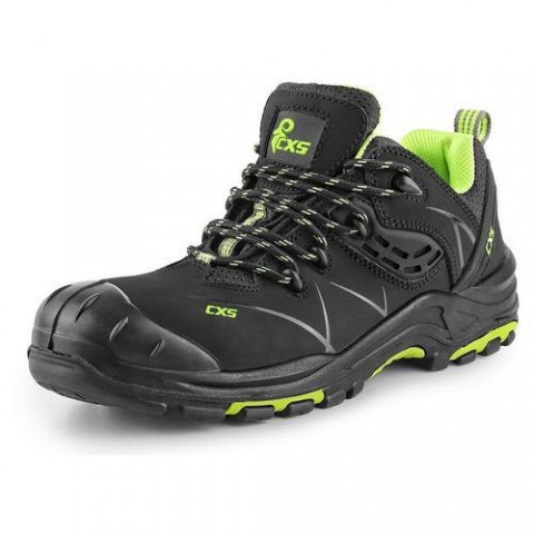 Bezpečnostní polobotka, kožená, s plastovou špicí a planžetou Dyna-Flex®, reflexní doplňky. Materiál: svršek z 1,6 - 1,8 mm štípenkové nubukové kůže (z jednoho dílu), vnější TPU ochrana paty, bez kovových součástí, podšívka z prodyšné oděru odolné textilie, podešev: PU-guma, olejivzdorná, antistatická, protiskluzová, odolná proti propichu a kontaktnímu teplu do 300 °C. Velikost: 37-49 Stupeň ochrany: S3 Ochrana: S vyztuženou špičkou a podrážkou Reflexní doplňky: AnoObuv CXS UNIVERSE CLUSTER S3, polobotka