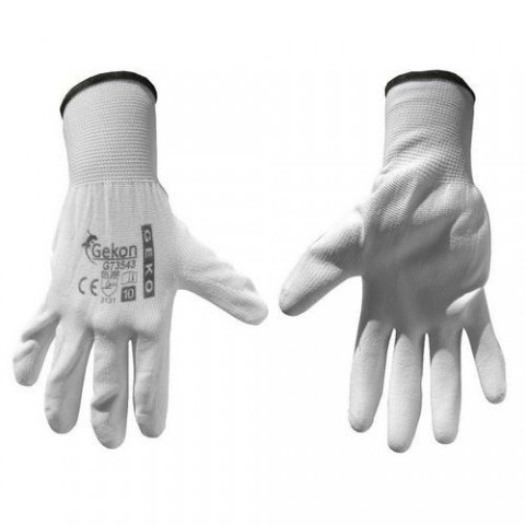 Ochranné rukavice v bílé barvě v praktické velikostiOchranné rukavice bílé z pletené bavlny, polomáčené v PU, GEKO