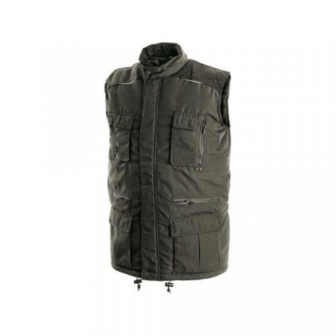 Zelená zateplená pracovní vesta s rameny a límcem prošité manšestrem. Vesta má 14 kapes, z toho tři vnitřní. Možnost stažení vesty v pase.Pánská zimní vesta CXS Ohio, zelená