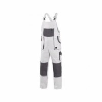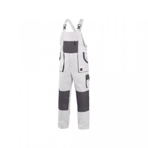 Bílé pánské montérky s laclem s šedými doplňky. Náprsní kapsa na zip, velké přední a menší boční kapsy schovají telefon, metr a další drobné předměty potřebné k práci. Zdvojená vyztužená partie kolen pomůže při častém klečení. Kšandy do gumy se zapínáním na plastovou přezku.Pánské montérkové kalhoty CXS s laclem, bílé/šedé