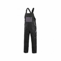 Černé pánské montérky s laclem s šedými doplňky. Náprsní kapsa na zip, velké přední a menší boční kapsy schovají telefon, metr a další drobné předměty potřebné k práci. Zdvojená vyztužená partie kolen pomůže při častém klečení. Kšandy do gumy se zapínáním na plastovou přezku.Pánské montérkové kalhoty CXS s laclem, černé/šedé