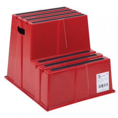 Široké pracovní podesty s gumovými patkami pro lepší stabilitu. Stupně jsou opatřeny abrazivními páskami snižujícími riziko pádu z podesty. Snadné přemisťování díky nízké váze a bočním úchytům.Plastové pracovní podesty, červené - Manutan Expert