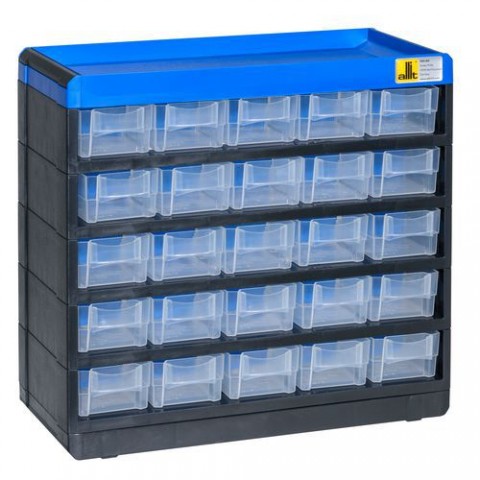 Plastové organizéry se zásuvkami řady VarioPlus Pro se vyznačují velmi robustním provedením. Vysoká stabilita díky přihrádkám z plastových profilů. Vysoká nosnost díky ocelovému obložení spodní části přihrádek. Zásuvky jsou zajištěny proti vypadnutí. Možnost čtyřbodové montáže na stěnu. Vhodné pro profesionální použití (např. pro skladování součástek a jiných dílů). Horní část organizéru vhodná např. pro odkládání nářadí. Dodáváno včetně děličů do zásuvek.Plastový organizér VarioPlus Pro 29/50, 25 zásuvek