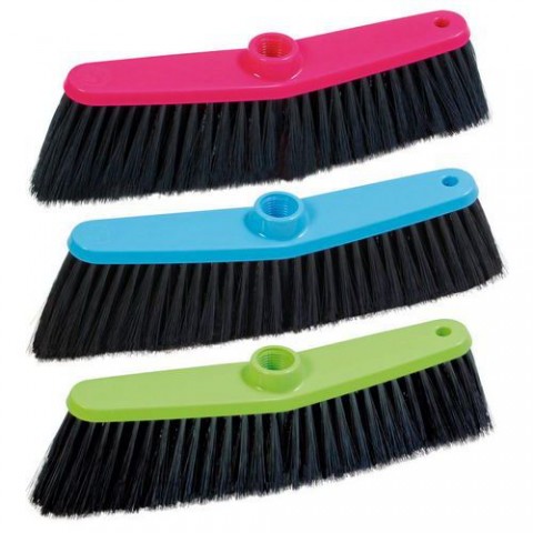 Plastový smeták se syntetickými vlákny. Připevnění tyče pomocí závitu. Dodáváno v různém barevném provedení.Plastový smeták bez tyče