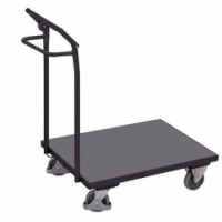 Transportní plošiny s madlem a ruční brzdou (dead-man's brake). Při uvolnění brzdné páky se vozík automaticky zastaví. Ložná plocha z MDF desky. Nakládací výška 215 mm. 2 pevná a 2 otočná kola. Šedá kola z termoplastické pryže nezanechávající stopy na plastovém ráfku s přesnými kuličkovými ložisky.Plošinové vozíky s madlem a ruční brzdou, do 250 kg, 94,5 x 60 x 101,5 cm