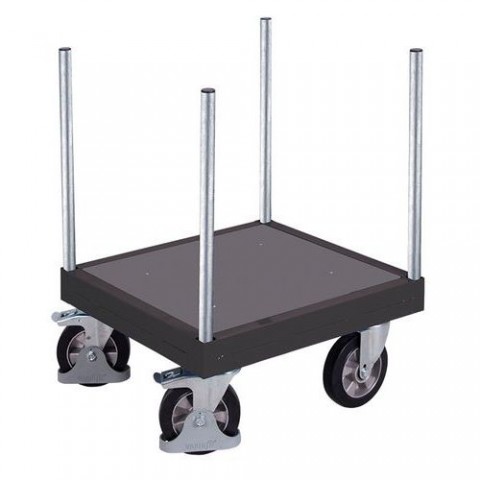 Plošinový vozík se čtyřmi pozinkovanými vzpěrami, které zabraňují vypadnutí břemena z vozíku. Délka tyčí 610 mm, šířka mezi tyčemi 625 mm. Ložná plocha z voděodolné lepené překližky. 4 otočná kola, z nichž 2 jsou opatřená brzdou. Elastická celopryžová kola na litém hliníkovém ráfku s přesnými kuličkovými ložisky.Plošinové vozíky se 4 tyčemi a protiskluzovým povrchem, do 1 200 kg, 70 x 70 x 94 cm